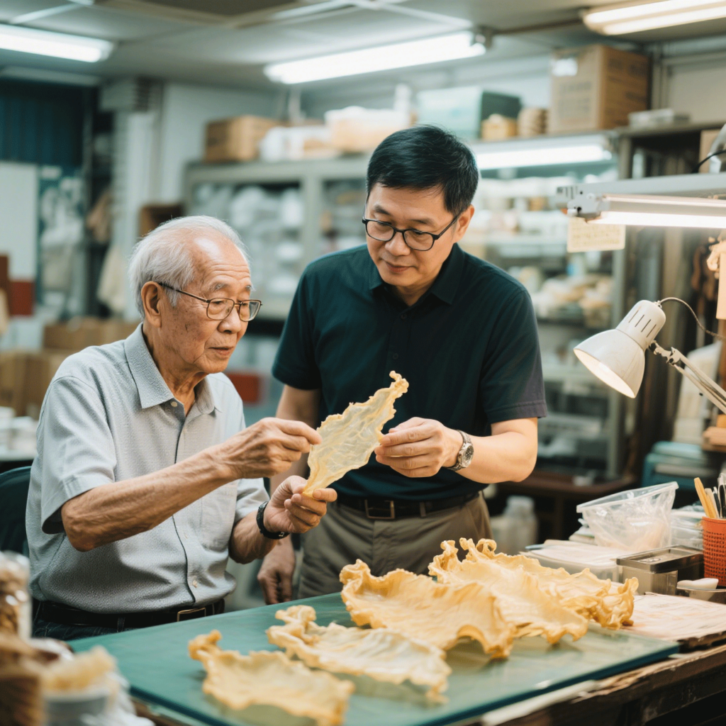 在上環永樂街的百年海味鋪裏,專心樓的品控團隊正在向 86 歲的林師傅學習花膠鑑別: